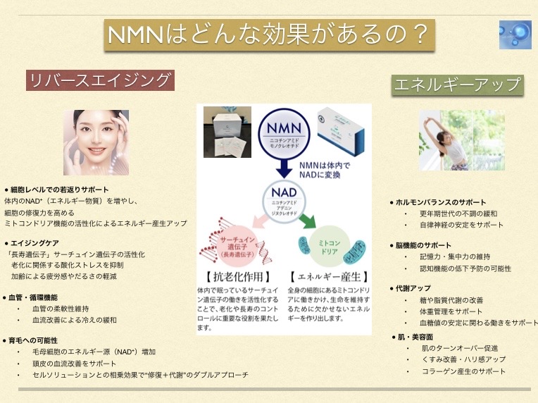 NMNは、サーチュイン遺伝子(長寿遺伝子とも呼ばれる)を活性化させることで、老化を抑制し、若々しさを保つ効果が期待できます