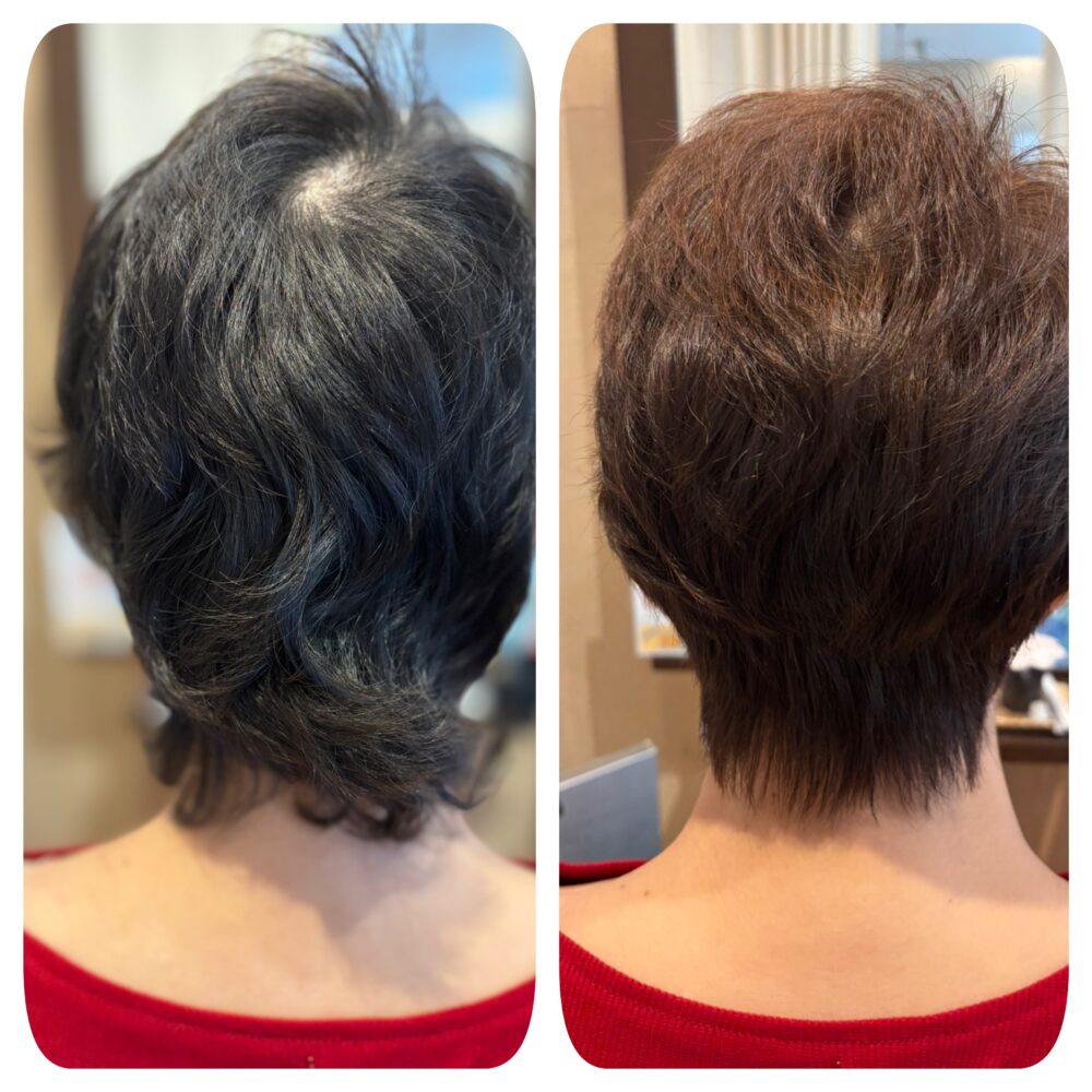 当店は医療用wigも取り扱っている関係上、抗がん剤治療後に初めてのカラーをしたいというご要望も多く頂きます。基本的には発毛後1年という期間を開けてされる方が多いです。(主治医にご相談ください)