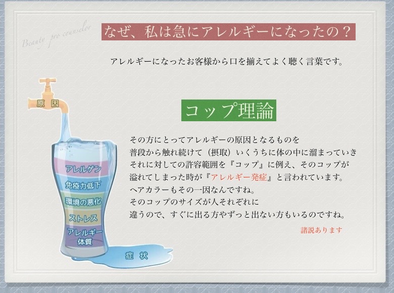 • ジアミンアレルギー → カラー履歴・金属・食事・体調などの“総合的な負担”でコップが満杯に