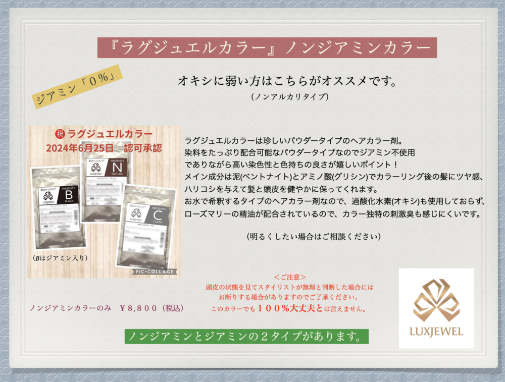 当サロンでは、従来のジアミン入りカラーにアレルギー反応を起こされた方、頭皮が敏感になってきた方、そして「カラーを我慢したくないが、安心・安全にもこだわりたい」方へ向けて、ジアミンを排除したカラー剤・施術を提案しています。