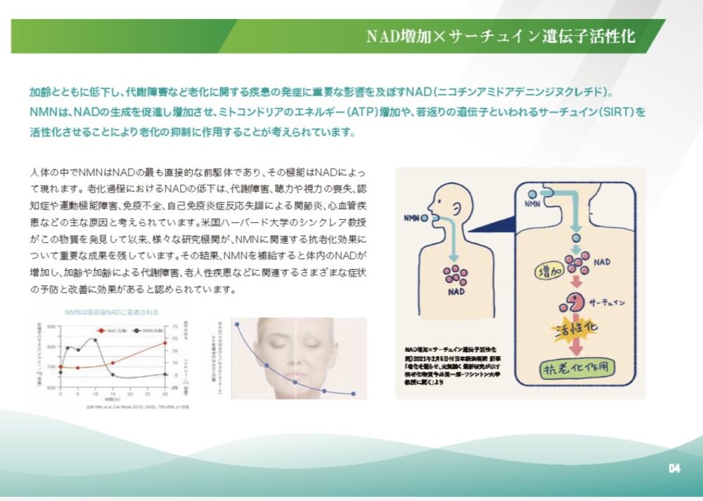 NMNはもともと人の体内に存在する物質で、年齢とともに減少していく「NAD」という重要な補酵素の材料になります。